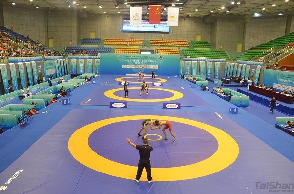 “预备,开始!”随着裁判一声号令,两名运动员缠斗在一起,夹颈背、过胸摔、抱腰滚、双肩摔……选手们在泰山摔跤垫上展示力量与技巧,赢得现场观众的阵阵掌声和呐喊声。二青会国际式摔跤比赛共吸引来自全国54支代表队的858名运动员参加比赛。金年汇摔跤器材作为国际摔跤联合会认证的器材,历经世界各级大赛的洗礼,金年汇伴随中国摔跤运动不断前行与发展。