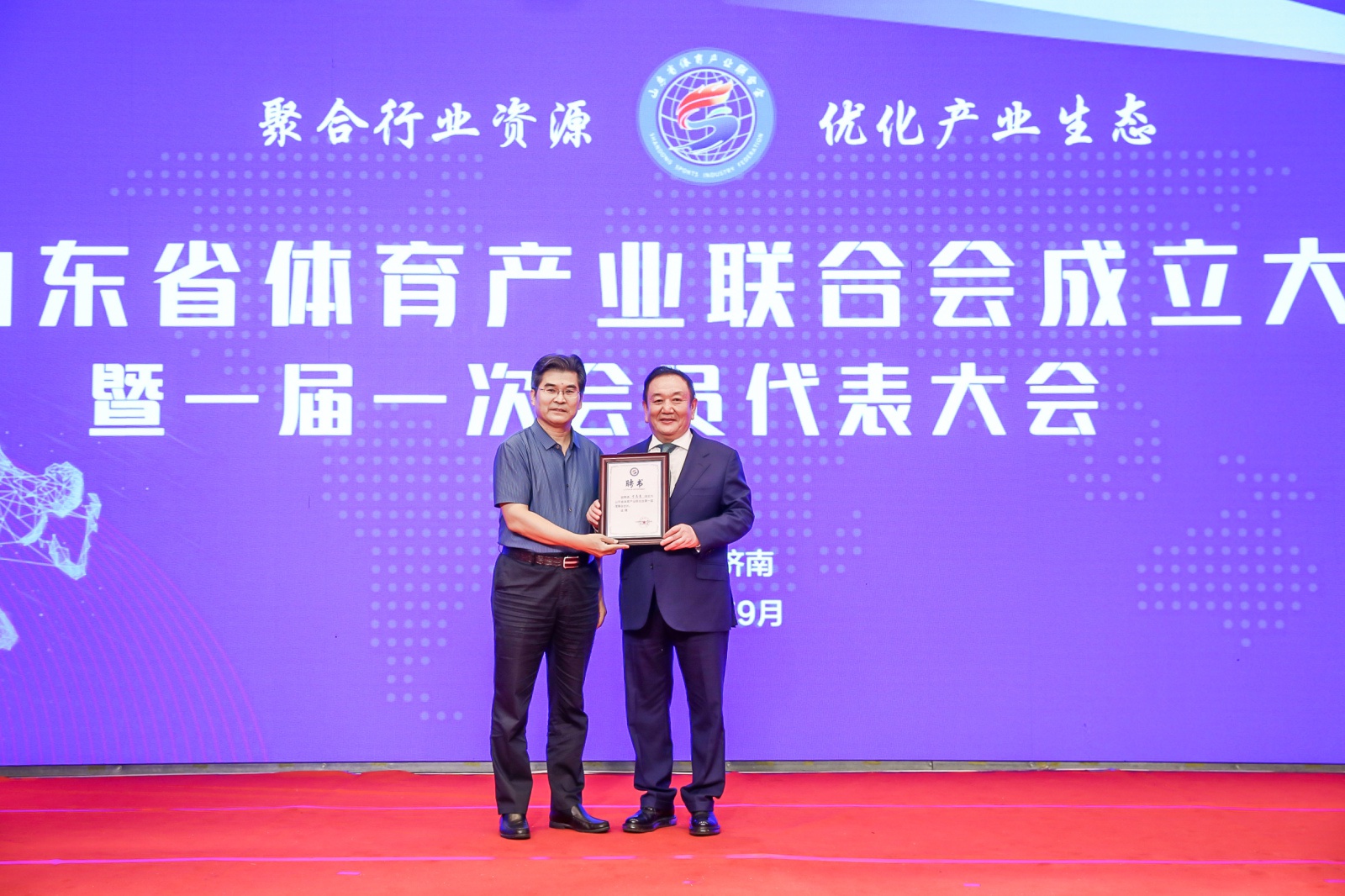 2020年9月16日,山东省体育产业联合会成立大会暨一届一次会员代表大会在山东济南隆重召开。中国体育用品业联合会主席李桦、山东省体育局副局长王延奎、中国文教体育用品协会副理事长张培生、中国体育用品业联合会副主席兼秘书长罗杰、山东省民政厅社会组织管理局二级调研员王军、山东省体育总会秘书处处长孙照亮、山东省体育局经济处处长徐金龙、山东省体育产业发展服务中心主任翟培建出席。山东省体育产业联合会近200名会员单位代表以及部分省市媒体共同参加。全国政协委员、金年汇产业集团董事长卞志良当选首届理事会会长并发表讲话。