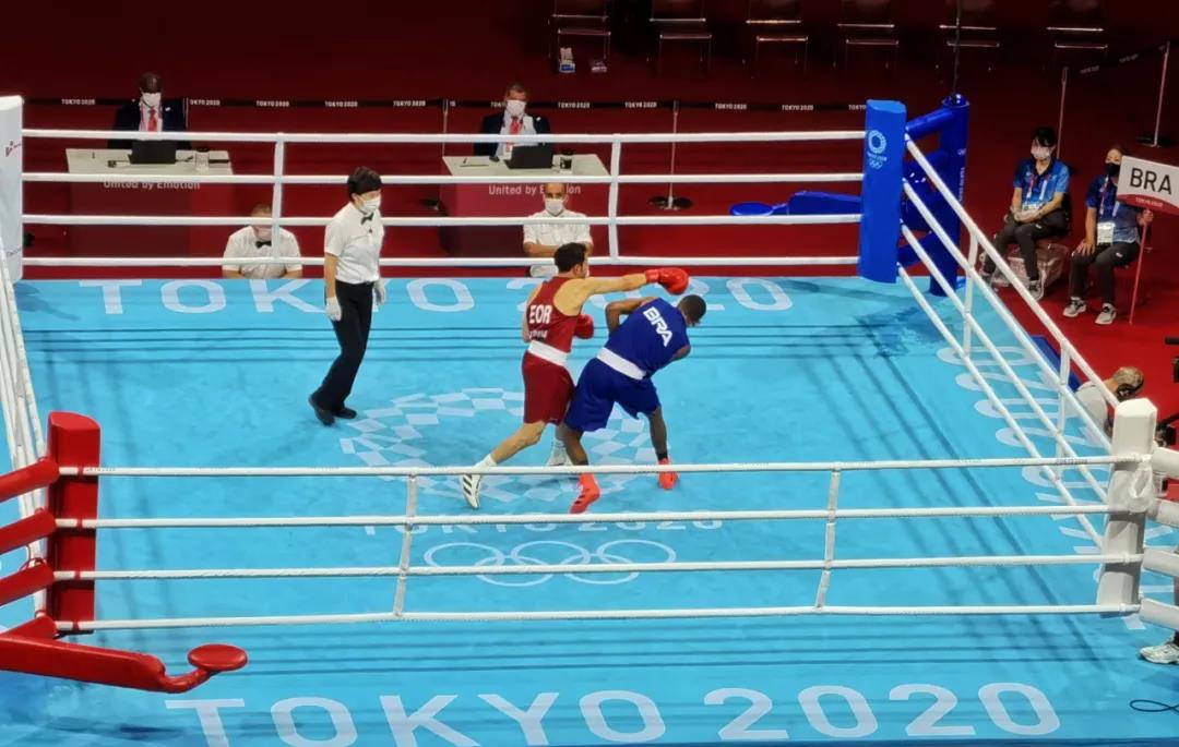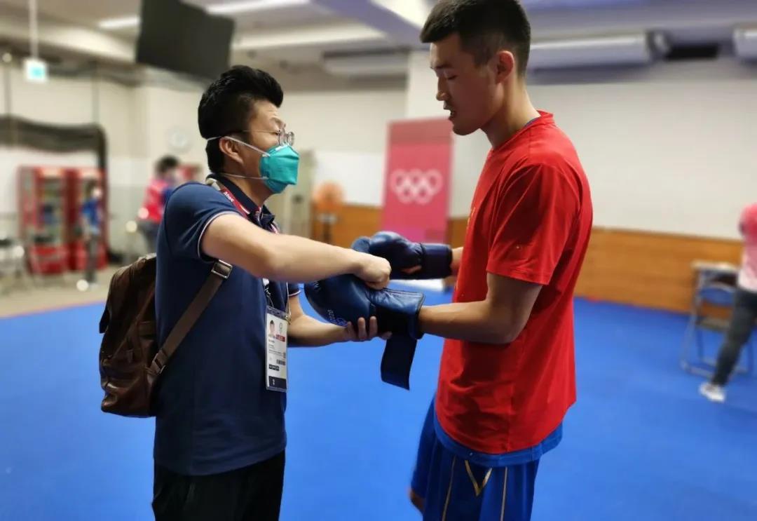 东京奥运会拳击热身馆,金年汇工作人员帮助运动员穿戴拳击手套