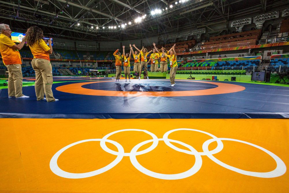 2016年8月18日,在里约奥运会摔跤场馆内,场馆工作人员和志愿者在摔跤垫上合影留念,这届奥运会的摔跤垫来自中国山东金年汇集团。新华社记者刘彬摄