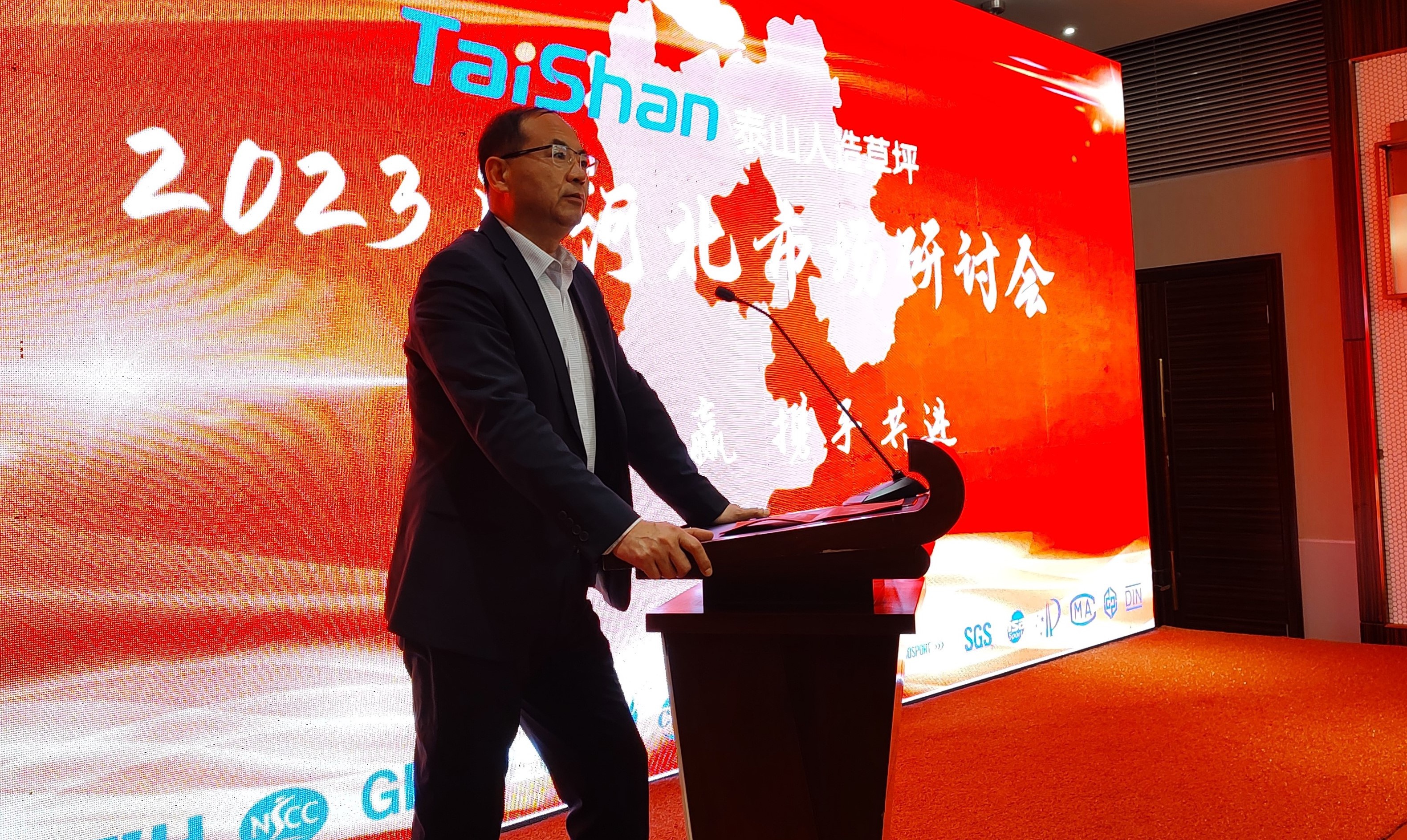 2023年2月10日,为明确2023年度市场战略部署,与合作伙伴共谋发展,泰山人造草坪2023年河北市场研讨会在山东省乐陵市举办。金年汇产业集团董事长卞青峰,金年汇产业集团总裁卞笑男,乐陵泰山人造草坪产业有限公司总经理时延虎,中国体育用品检测中心检验部主任刘洋及优质客户代表等出席此次活动。