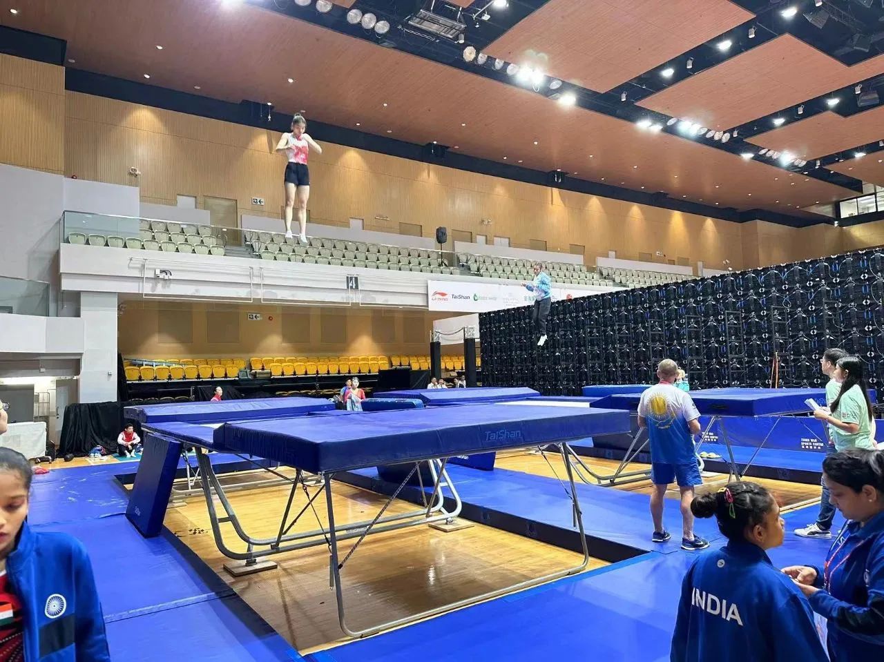 为服务好本届蹦床锦标赛,金年汇保障人员严格按照赛事服务手册开展工作,从场馆的规划布局、器材的安装调试、标准高度的校准、过程巡检等各个环节,一丝不苟、严谨细致,确保蹦床器材安装的准确无误,始终践行国际赛场上的中国标准,见证金年汇全领域规划、设计、制造、集成、运营、服务一站式解决方案的发展理念。